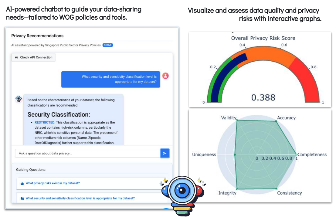 DataSharingAssist (DSA) is an AI-powered educational tool, enhanced with WOG policies and tools, designed to help public officers confidently manage inter-agency data requests. By providing data-driven recommendations on data privacy risks and data quality, DSA streamlines decision-making, making data sharing more efficient and stress-free—ultimately fostering openness and progress.