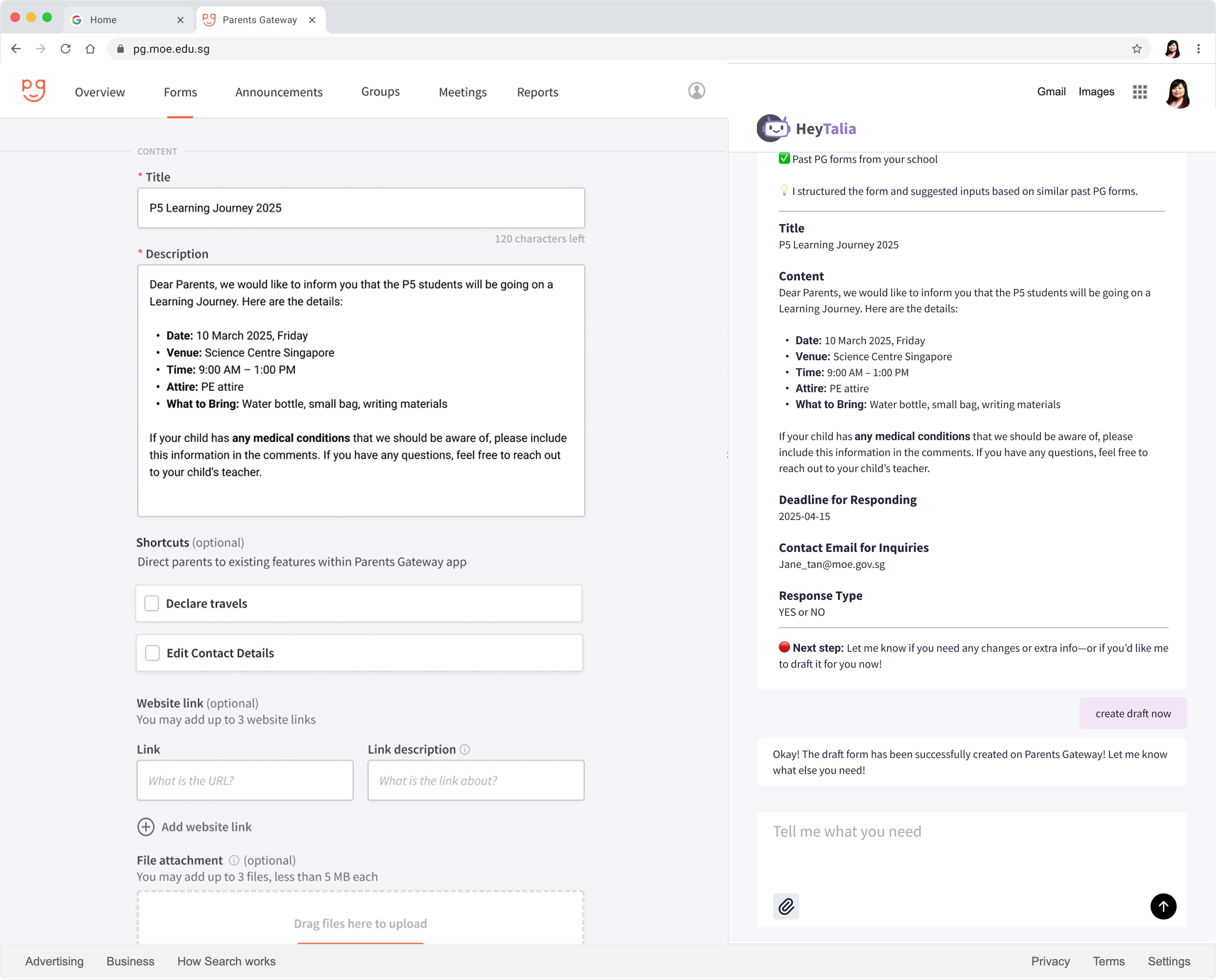 Given the time constraints, our initial prototype tackles one of the most challenging administrative tasks—communication. HeyTalia personalises the experience by recognising each teacher’s identity upon login and enhancing content generation based on the school’s writing style. It also syncs with personal or school calendars to support better content generation for school programmes with minimal prompting.