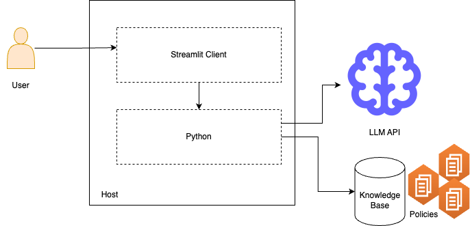Our current tech stack is built around a Streamlit app in Python, enabling users to submit queries about system compliance or a specific SaaS. The backend connects to a knowledge base of policy documents, retrieving relevant information for analysis. Once the relevant documents are identified, the system prompts an LLM over an API with the user’s query, ensuring responses are contextually accurate and policy-aligned. The client then returns a chat-based response, potentially accompanied by a compliance score report, giving users a clear and actionable assessment of their compliance status. This architecture ensures efficient document retrieval, intelligent query processing, and real-time compliance insights in a user-friendly interface.
