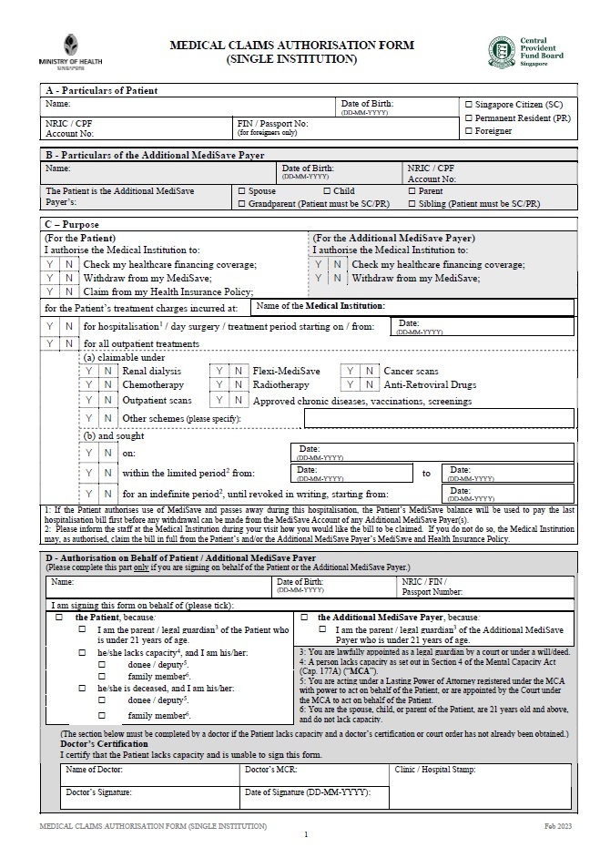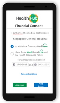 When a patient seeks treatments from one or more medical institutions, they may or may not authorise the medical institution(s) to deduct from their Medisave accounts and/or their family members' Medisave accounts. In addition, they may or may not authorise the medical institution(s) to use their MediShield Life accounts and Integrated Plan to pay for the medical bills.