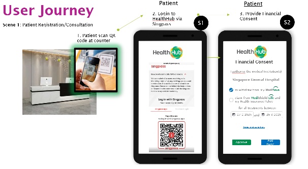 As part of the Minimum Viable Product (MVP), users can scan a QR code at the hospital front desk during their initial visit. This will direct them to log in via Singpass and land on the HealthHub consent page, where the following details are pre-filled: